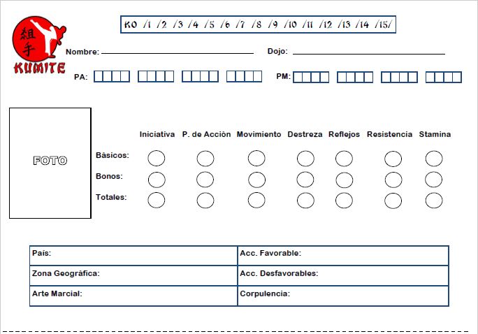 Hola a todos. Uno de nuestros jugadores de Kumite nos ha hecho un gran favor aportado una Ficha de Luchador Printer Friendly, es decir, en blanco y negro y con menos detalles para que cuando la saquéis en vuestra impresora no os consuma demasiada tinta (o sangre de unicornio como mucho la llamamos). Este trabajo lo ha realizado Jose Miguel y queremos agradecerle que nos ayude a mejorar en nuestro proyecto.