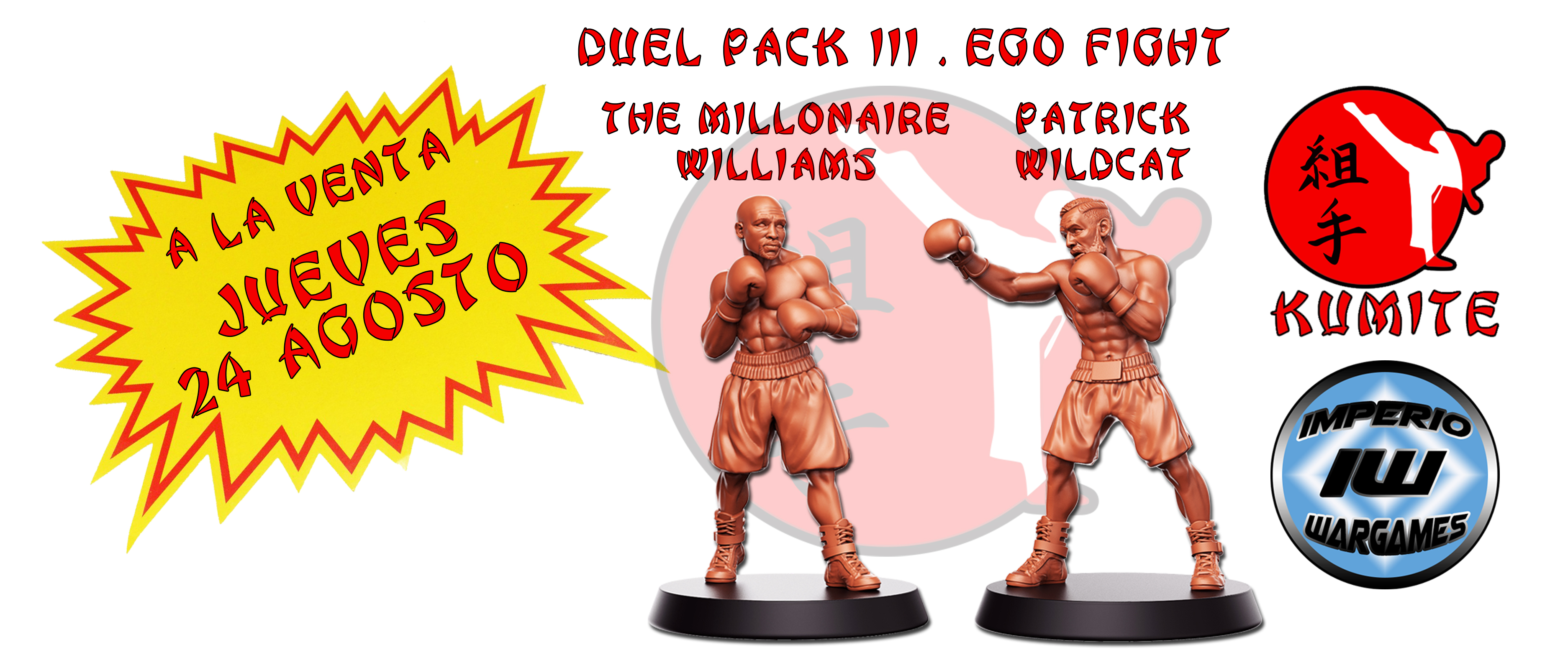 Hola artistas marciales. Nos complace anunciaros que el lanzamiento de nuestro próximo pack para Kumite lo haremos un par de días antes del combate del año: el Jueves 24 de Agosto. Este Duel Pack III contiene las figuras de ‘The Milloniare’ Williams y Patrick ‘Wildcat’. Como todos los packs, estas dos figuras incluyen 2 cartas de Técnicas por personaje más una carta de Evento, siendo las 5 cartas exclusivas de este pack. Este blister es indivisible, por lo tanto no se venderán las figuras sueltas ya que es tirada limitada. Su precio será de 20€.