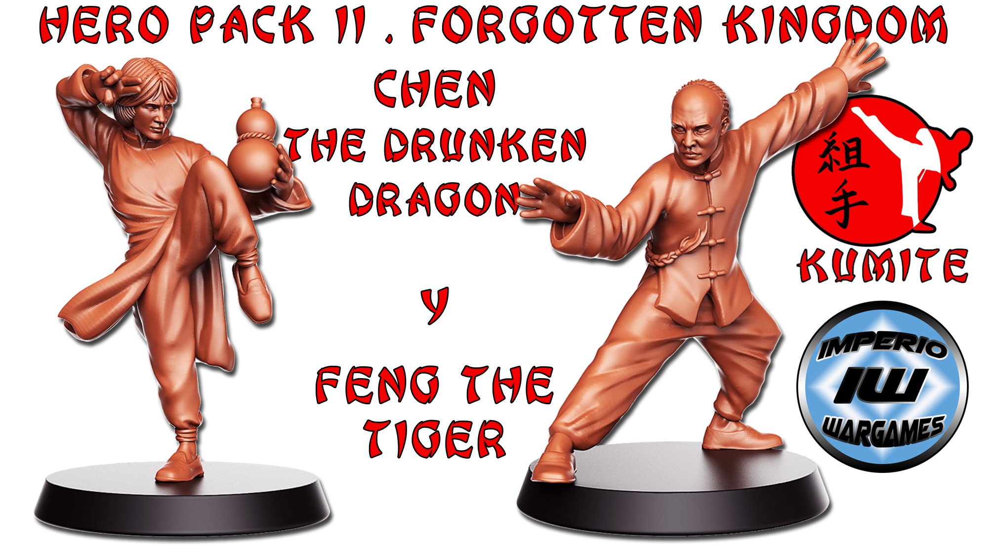 Volvemos de nuevo antes de lo habitual con novedades para Kumite. Ahora os mostramos los renders de las dos próximas figuras que verán la luz, que a su vez conformarán el Duel Pack III ‘Forgotten Kingdom’: Chen ‘The Drunken Dragon’ y Feng ‘The Tiger’. Ambas figuras se podrán adquirir tanto juntas como por separado, pero tened en cuenta que con el pack con dos miniaturas, obtendréis una Carta de Evento exclusiva de dicho pack.