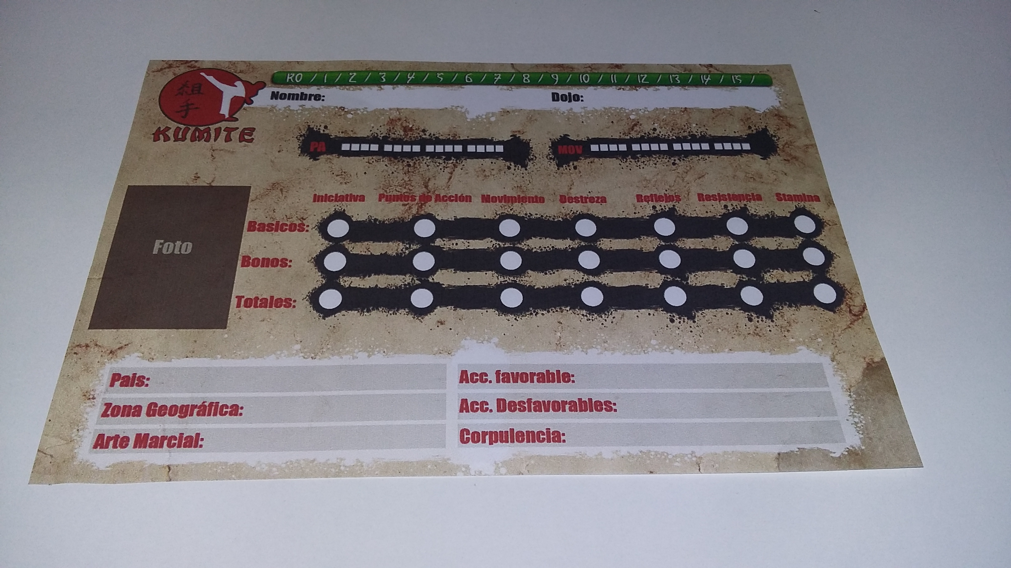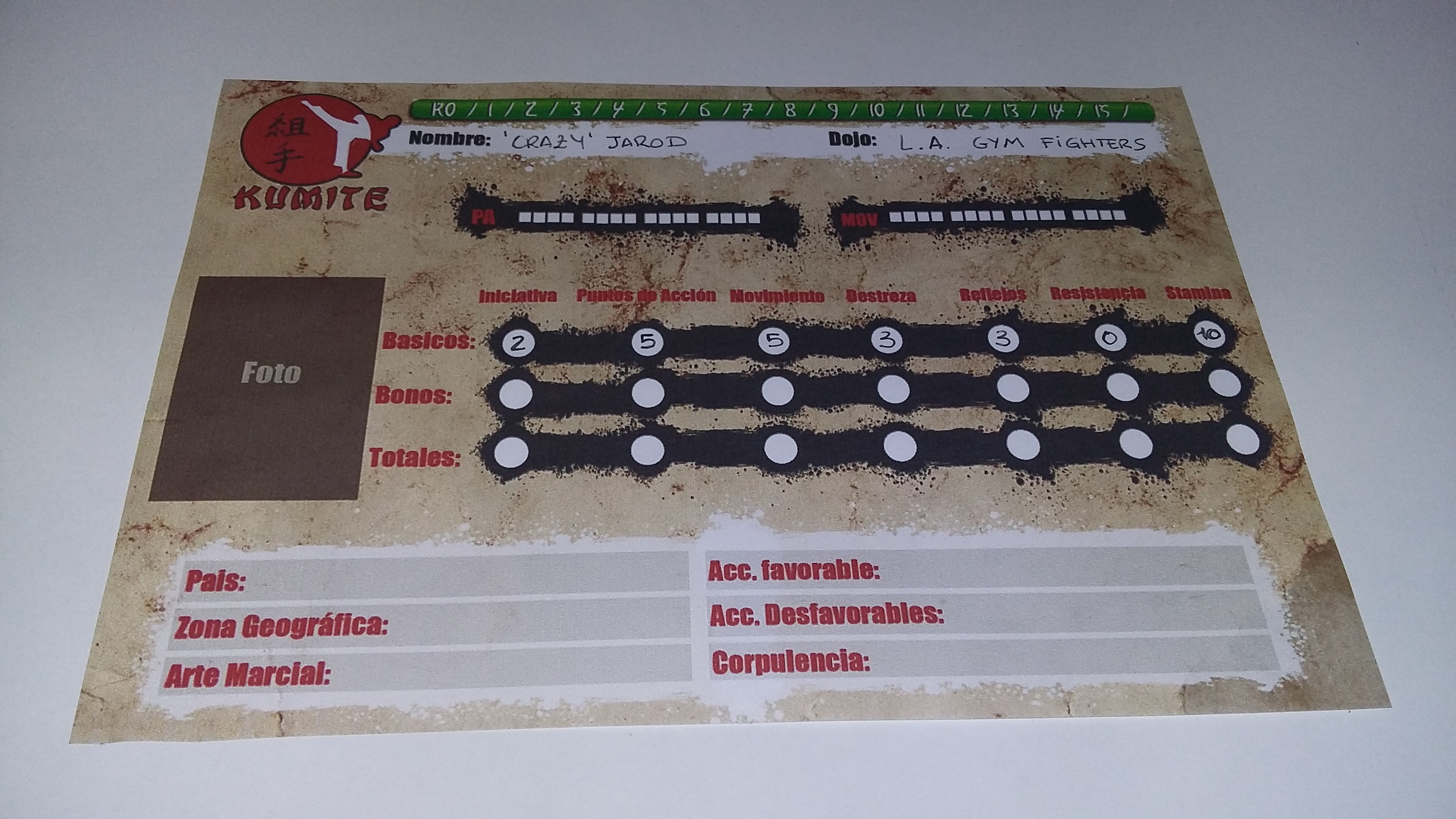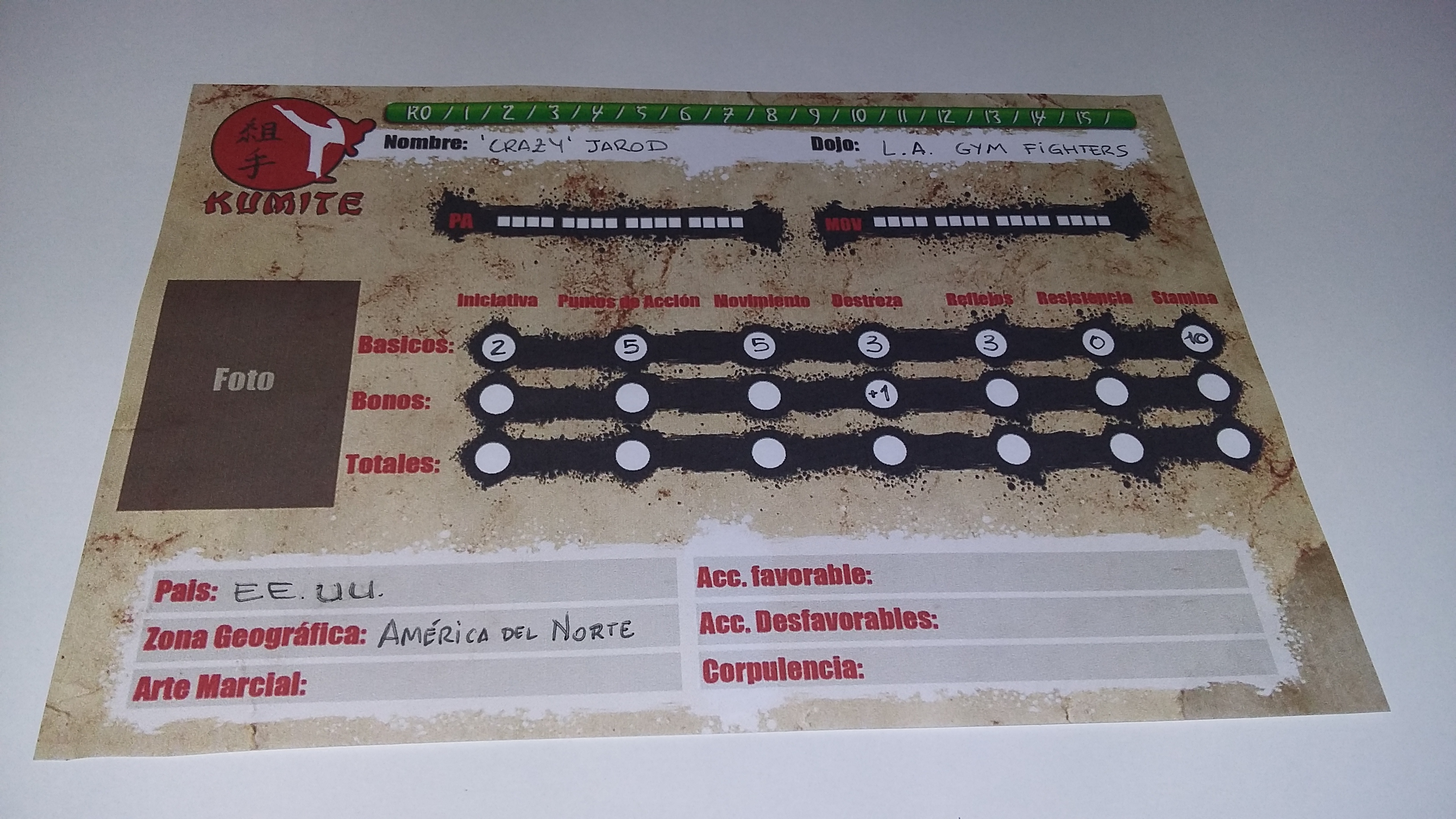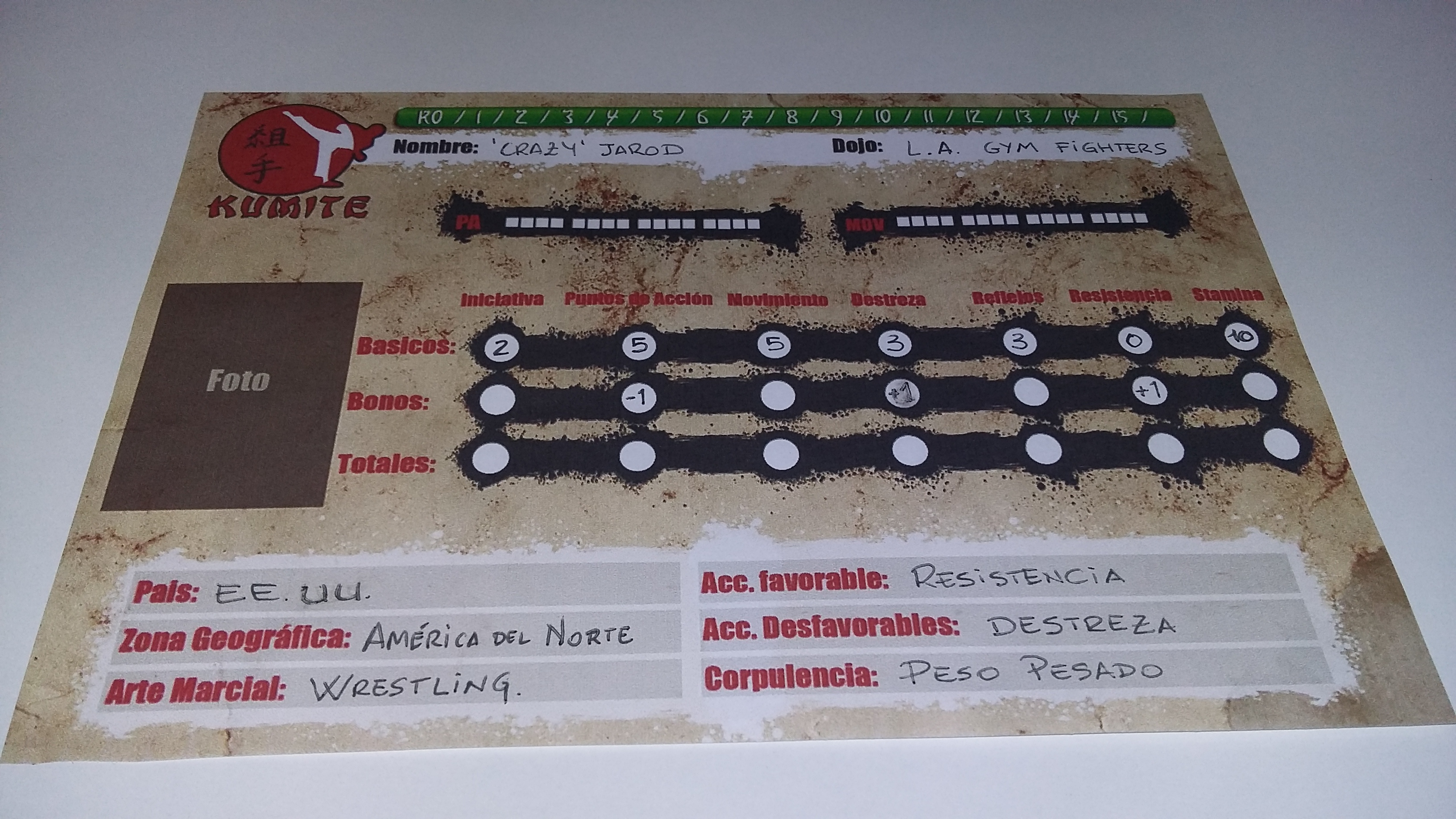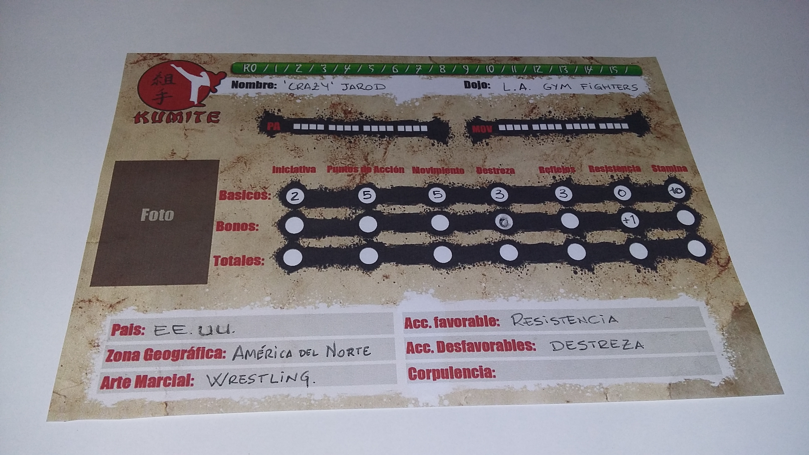 Lo primero que hemos hecho es imprimir una ficha de luchador para realizarla sobre ella. También podéis hacerlo manualmente con un folio y papel para después pasarlo ya una vez calculado los puntos del perfil a la ficha.