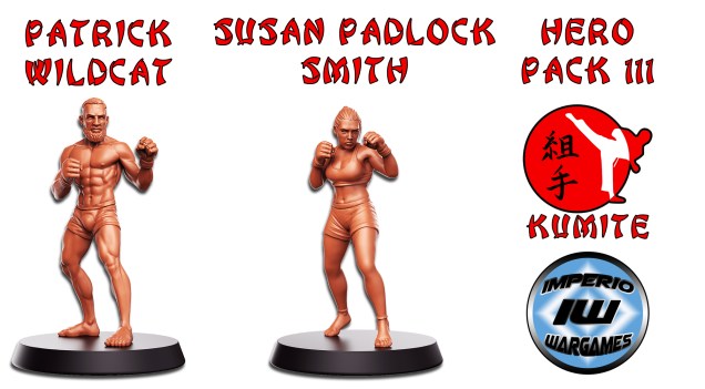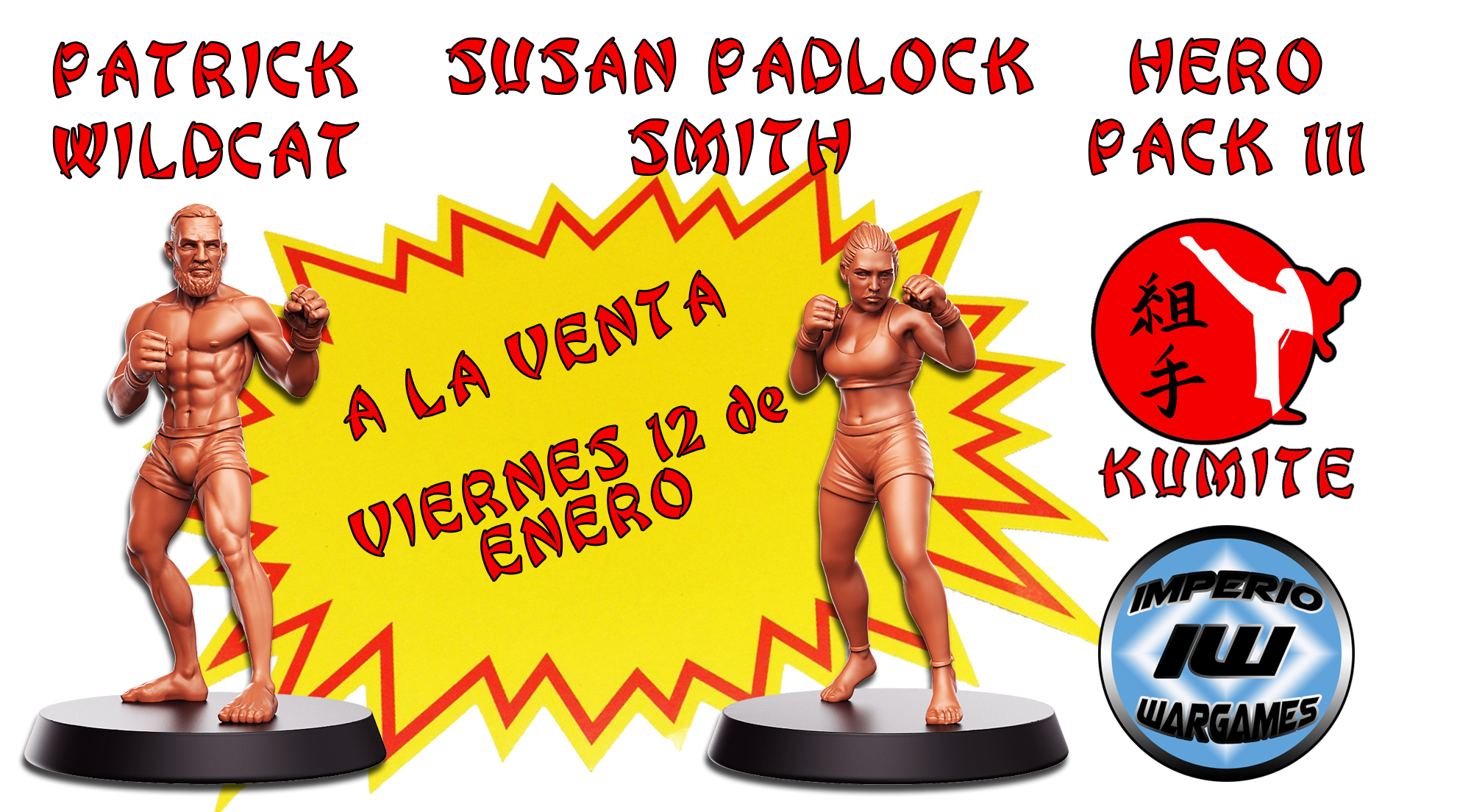 Hola artistas marciales. Nos complace anunciaros que el lanzamiento de nuestro primer pack para Kumite del año: el Viernes 12 de Enero. Este Hero Pack III contiene las figuras de Susan ‘Padlock’ Smith y Patrick ‘Wildcat’. Recordaros que las minis se pueden comprar tanto individualmente como por pack, incluyendo dos cartas exclusivas para cada luchador, y una carta de evento exclusiva para los que adquieran el Hero Pack II. Esperamos que os gusten.